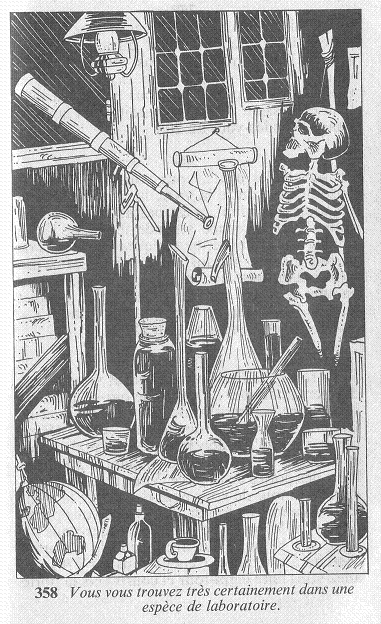 épinglées sur un mur, un squelette pendu à un crochet, et une table
