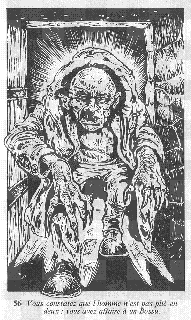 Alors que le combat vient de s'engager, vous constatez que l'homme n'est pas plié en deux. Vous avez affaire à un BOSSU. BOSSU HABILETÉ: 7 ENDURANCE : 7 Après trois Assauts, rendez-vous ici.